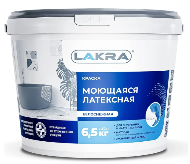 —Краска латексная моющаяся белая матовая 6,5кг ЛАКРА